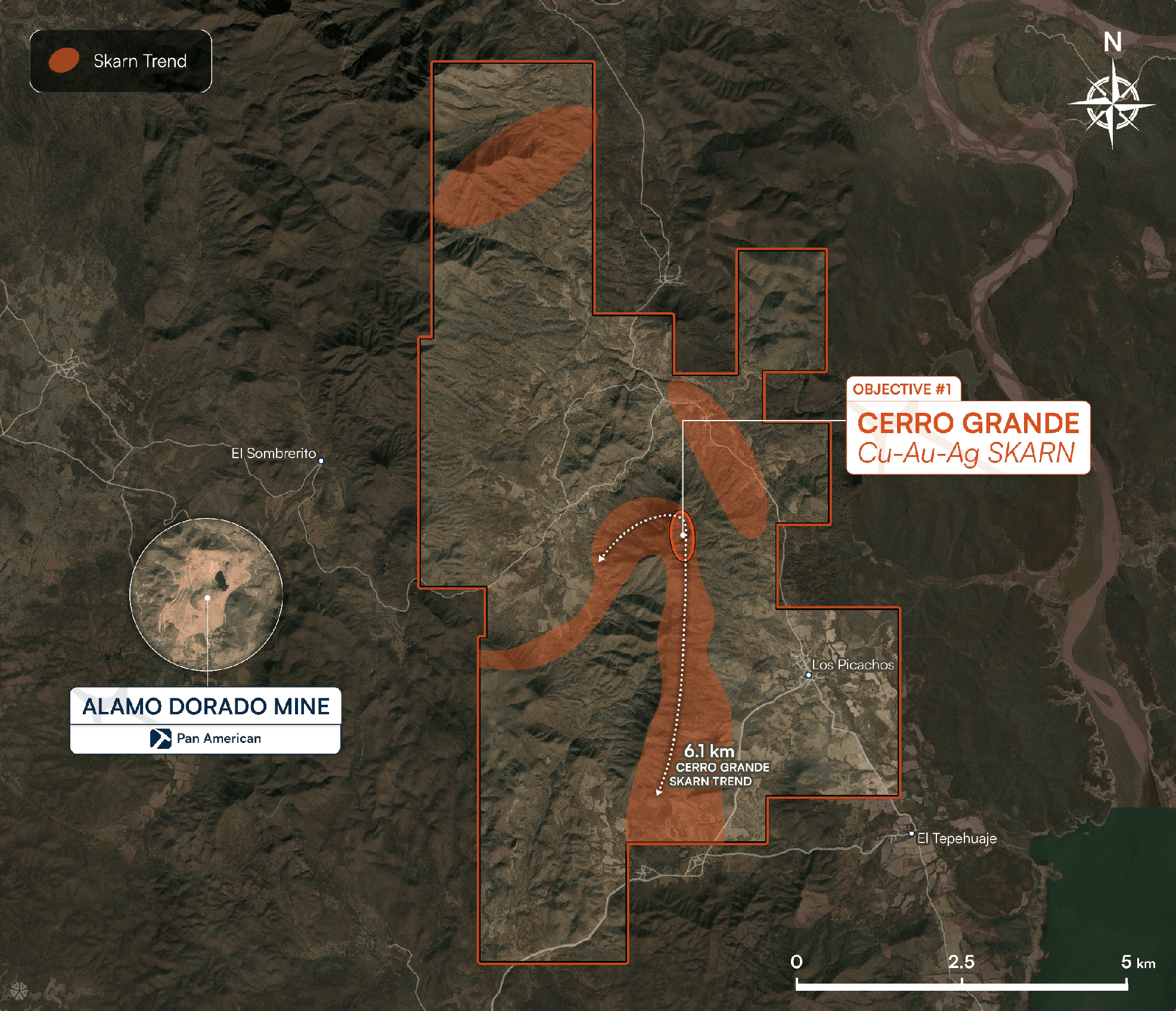 Anchored by the high-grade Cu-Au-Ag Cerro Grande Skarn discovery zone, the geological setting and mineral assemblages are characteristic of porphyry-skarn systems of north-western Mexico and bear similarities to the nearby Alamo Dorado (operated by Pan American Silver) and Piedras Verdes (Operated by Cobre del Mayo) deposits.